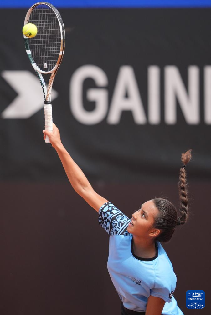 4月12日,中国队选手郭涵煜在单打比赛中发球。她2比0战胜太平洋大洋洲联队选手布西。