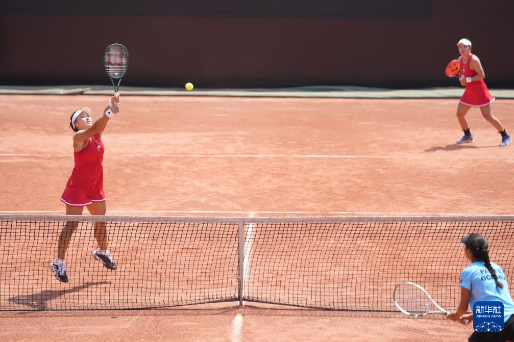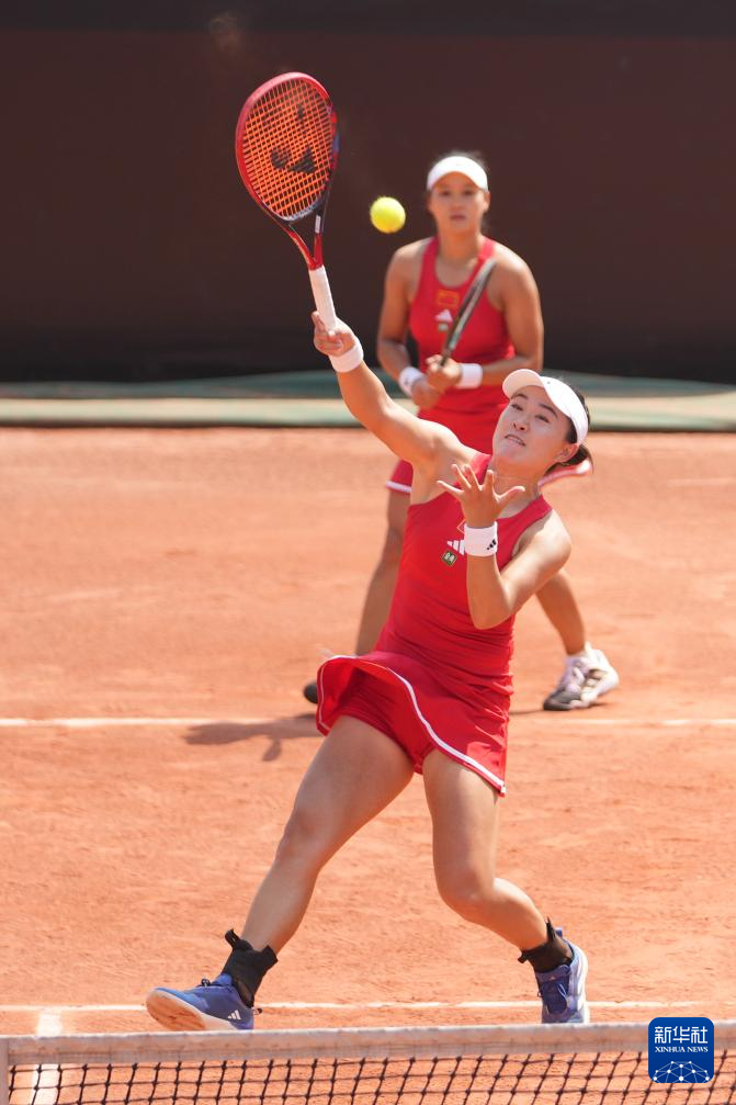 4月12日,中国队组合郭涵煜(左)/朱琳在双打比赛中回球。她们2比0战胜太平洋大洋洲联队组合布西/舒斯特。
