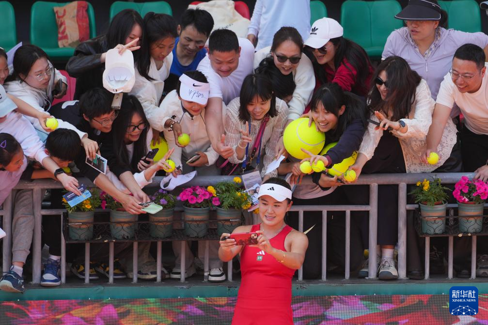 4月12日,中国队选手朱琳(下)在单打比赛后与观众合影。她2比0战胜太平洋大洋洲联队选手舒斯特。