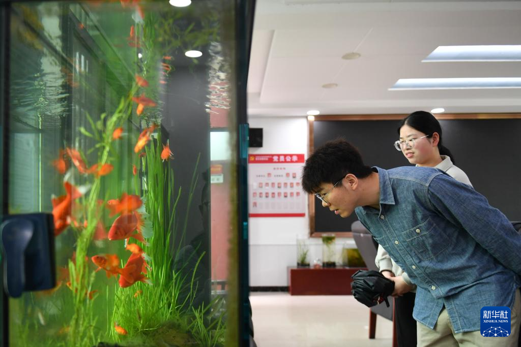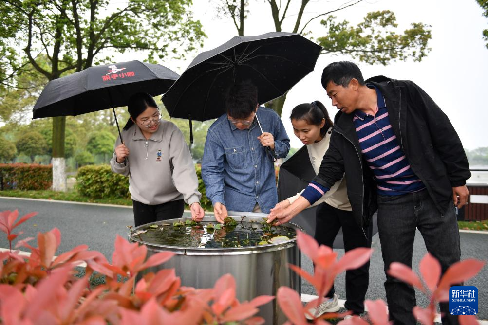 4月11日,在大通湖水生植物产业示范园,李杨(前)在查看一处观赏鱼和水草造景。