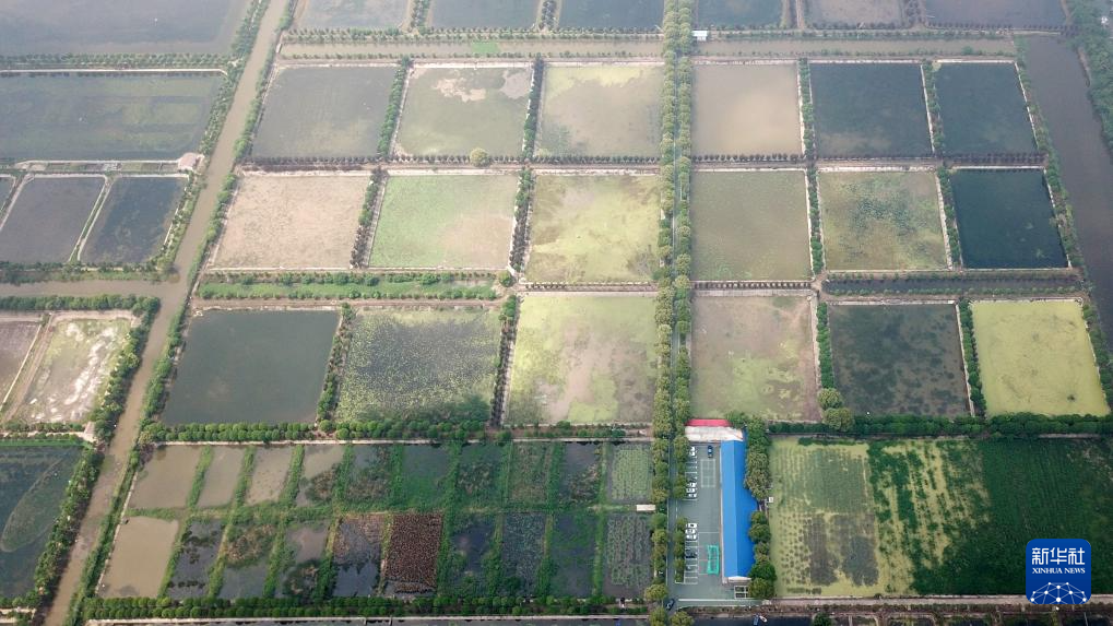 这是2023年4月20日拍摄的大通湖水生植物产业示范园,园内种植了多种水生植物(无人机照片)。