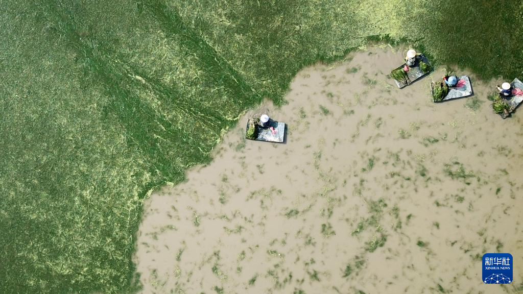 2023年4月20日,工人在大通湖水生植物产业示范园内采收水草(无人机照片)。