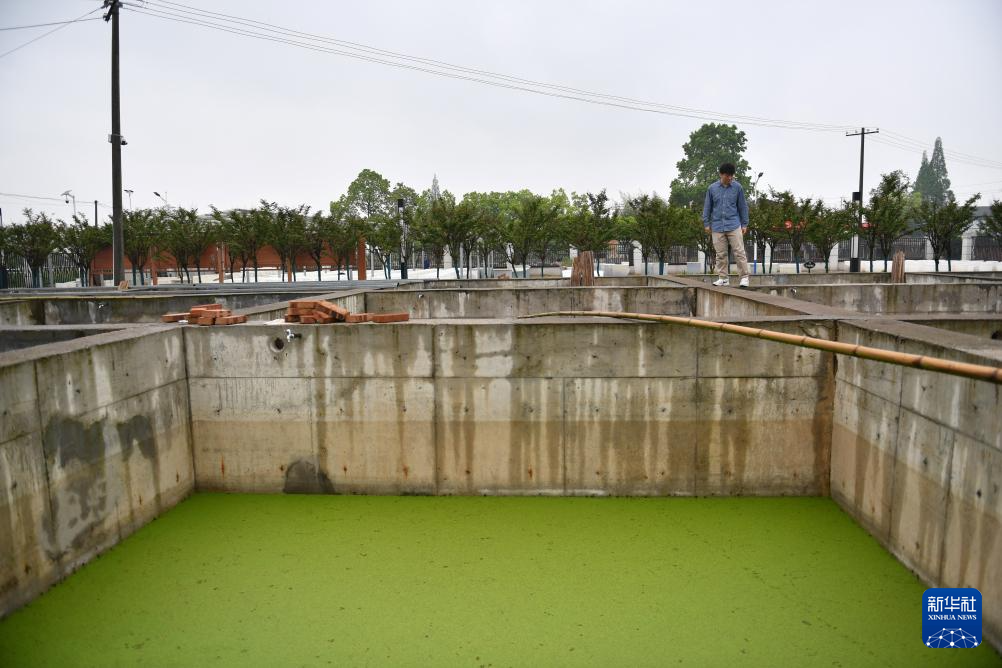 4月11日,李杨在大通湖工作站水泥池实验区查看培育的水草。