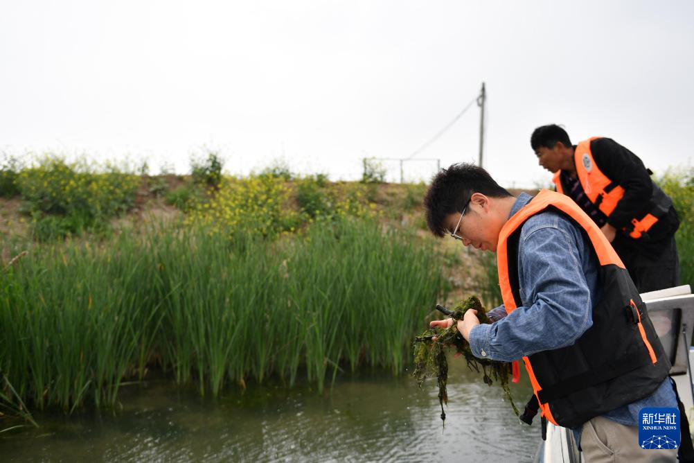 4月11日,李杨(前)在大通湖查看水草的生长情况。