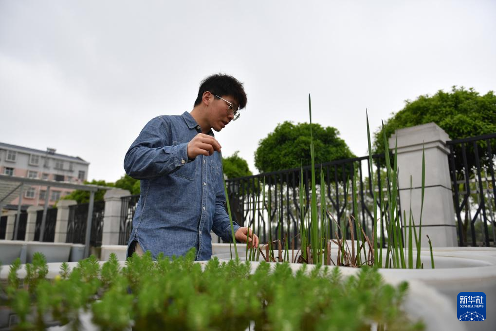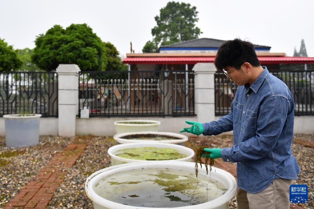 4月11日,李杨在大通湖工作站平台实验区查看培育的水草。