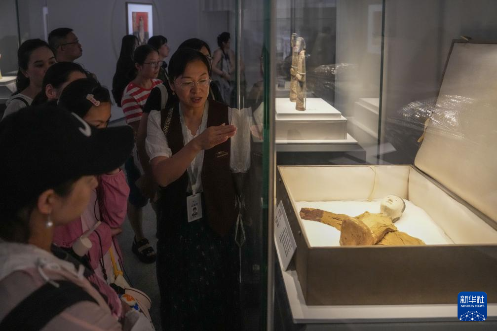 7月16日,志愿者(前右一)在湖南博物院为观众介绍“彼美人兮——两汉罗马时期女性文物展”。