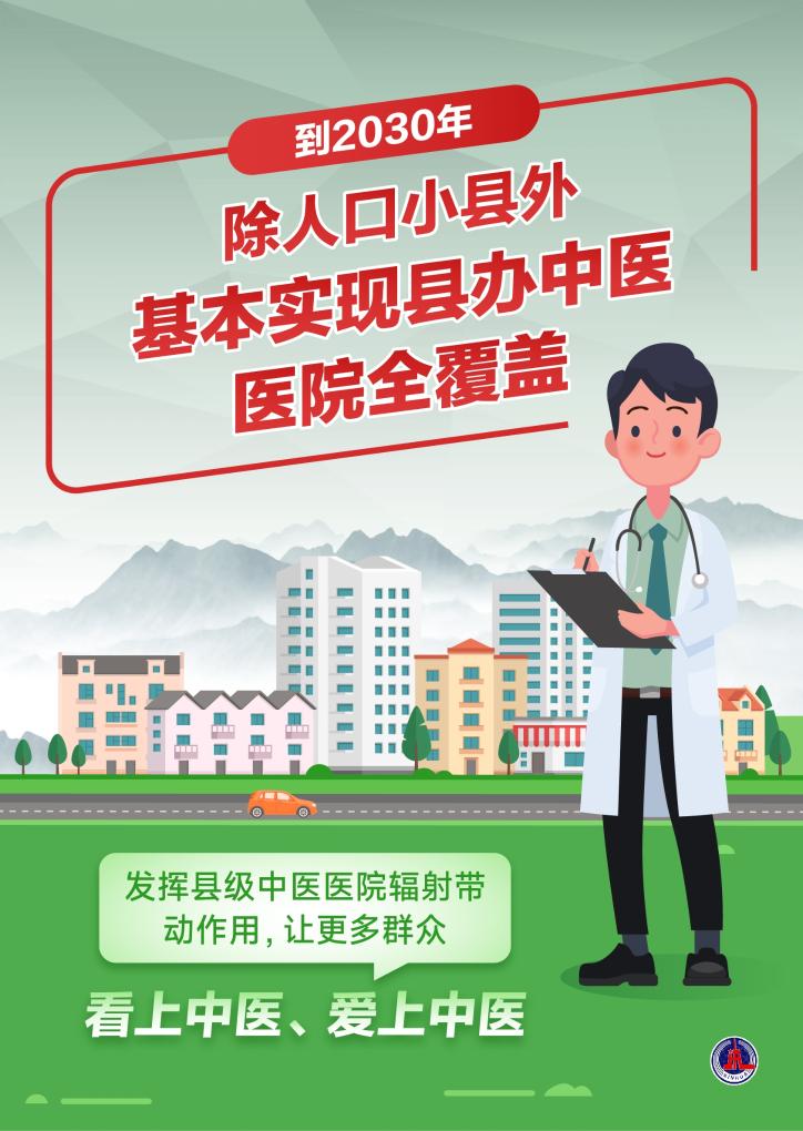 到2030年,除人口小县外,我国要基本实现县办中医医院全覆盖,力争实现全部县级中医医院医疗服务能力达标、达到二级甲等以上水平等目标……
