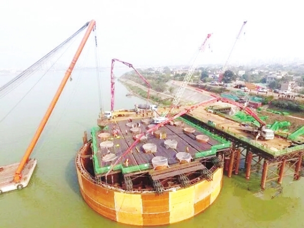 2017年12月7日,杨梅洲大桥河东23#主墩钢围堰封底混凝土、辅助跨大体积混凝土和承台大体积混凝土浇筑完成。