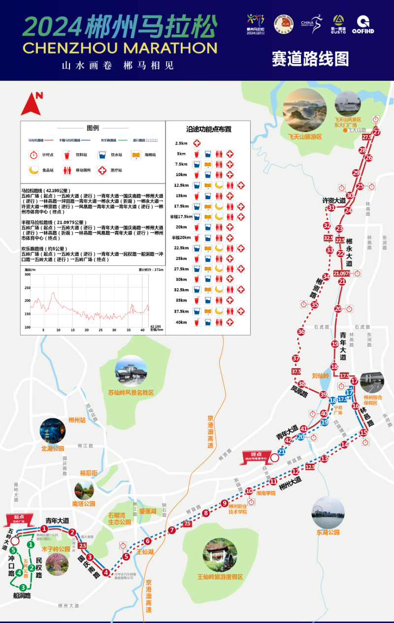 赛道以五岭广场为起点,沿五岭大道、青年大道、西河桥、红心路、凤凰桥,途经市体育中心、市文化艺术中心等地标建筑和苏仙岭、飞天山等景区景点,结合了自然风光,融入了城市人文,让每一位参赛者在奔跑中穿越历史的印记,感受自然的韵律,体验城市的活力。