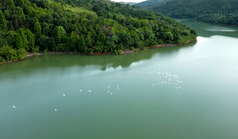 波光粼粼的水面上,亭亭玉立的白鹭结伴成群,聚时一片白,散时如星点。阳光照耀下,有的白鹭低头觅食,轻盈的步伐在浅水间留下一串串细腻如珠的涟漪;有的振翅高飞,洁白的身影在天空中划出一道道优雅的弧线;或成群栖息在树梢上,如一朵朵绽放的白玉兰,点缀在绿树碧水之间,尽显生态之美。