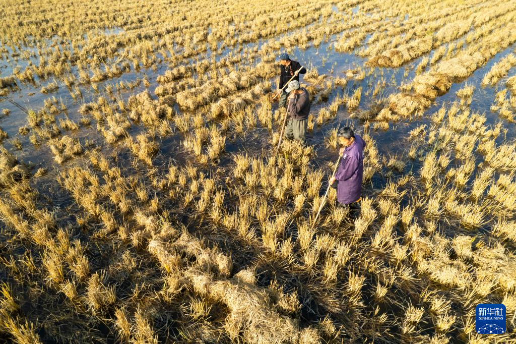 12月1日,在南县三仙湖镇三仙湖村一块稻虾田,村民翻动秸秆促进秸秆饵料化利用(无人机照片)。新华社记者 陈思汗 摄pagebreak