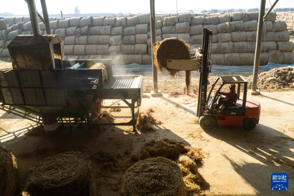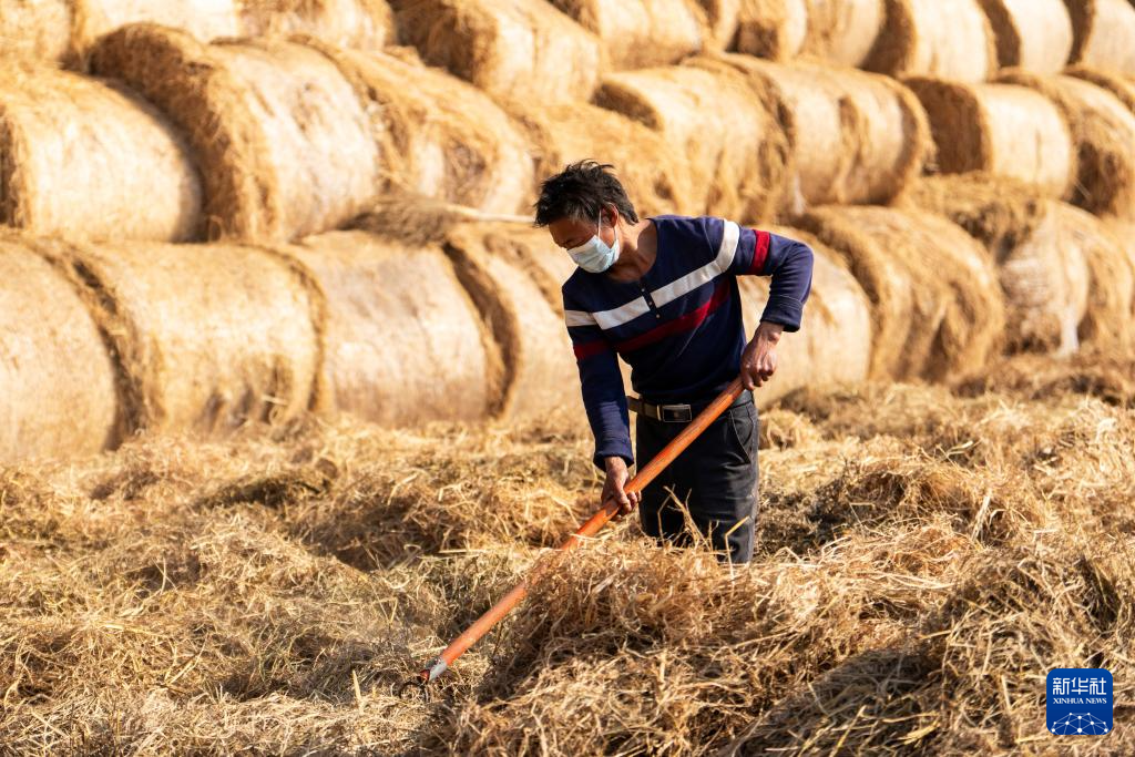 12月1日,在南县浪拔湖镇太阳山村一秸秆饲料化利用工厂,工人在晾晒秸秆。新华社记者 陈思汗 摄pagebreak
