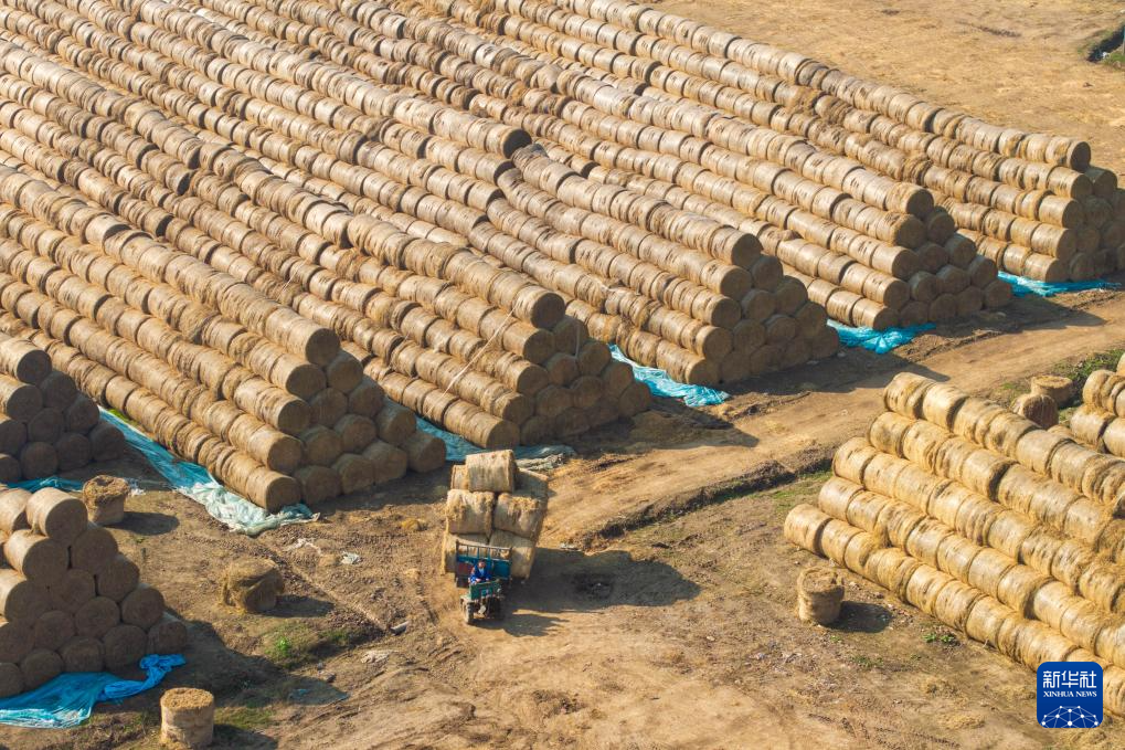 12月1日,在南县浪拔湖镇太阳山村一秸秆饲料化利用工厂,工人在运输秸秆(无人机照片)。新华社记者 陈思汗 摄