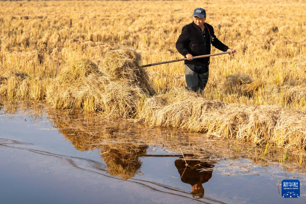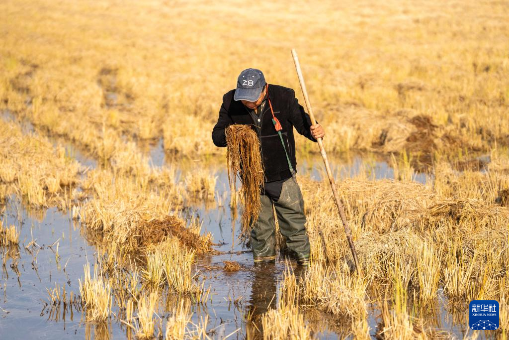 12月1日,在南县三仙湖镇三仙湖村一块稻虾田,村民翻动秸秆促进秸秆饵料化利用。新华社记者 陈思汗 摄pagebreak