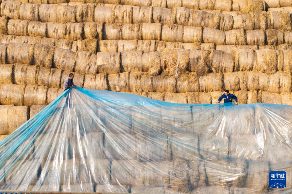 12月1日,在南县浪拔湖镇太阳山村一秸秆饲料化利用工厂,工人给秸秆覆盖防水膜(无人机照片)。新华社记者 陈思汗 摄pagebreak