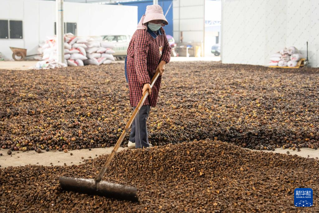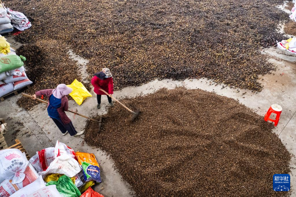 12月7日,工人在位于祁阳市八宝镇的湖南顾君茶油有限公司晾晒茶籽。新华社记者 陈思汗 摄