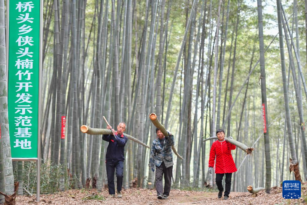 12月10日,在湖南省郴州市桂东县清泉镇桥头乡侠头村的楠竹开发示范基地,村民在搬运楠竹。新华社记者 陈泽国 摄