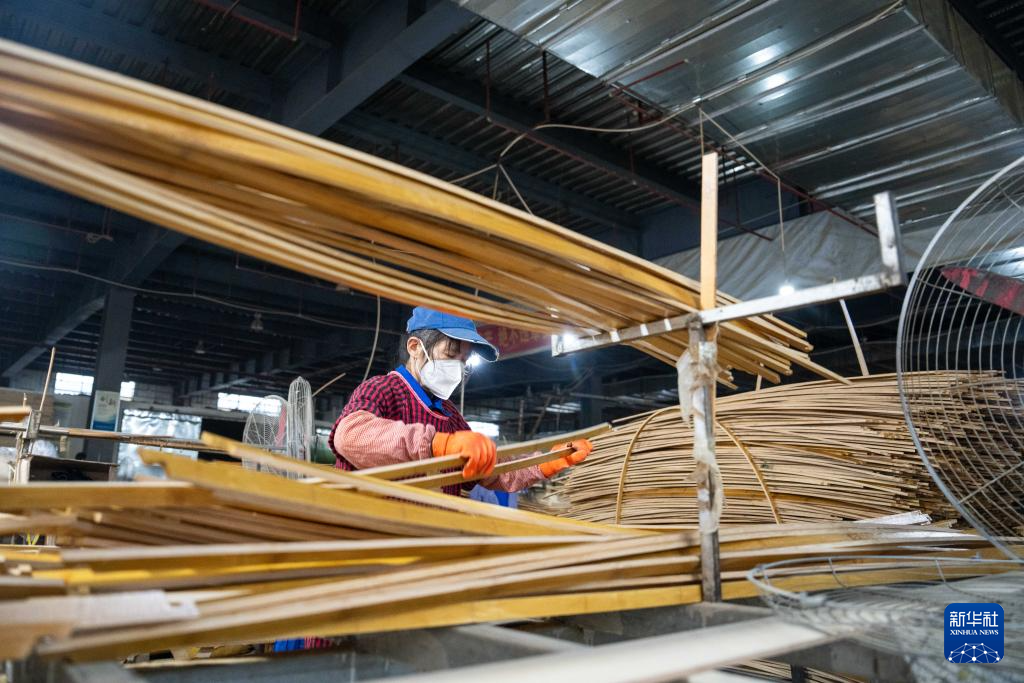 12月10日,在永州市双牌竹木产业科技园,湖南阳明竹咏科技有限公司的工人在加工竹条。新华社记者 陈思汗 摄pagebreak
