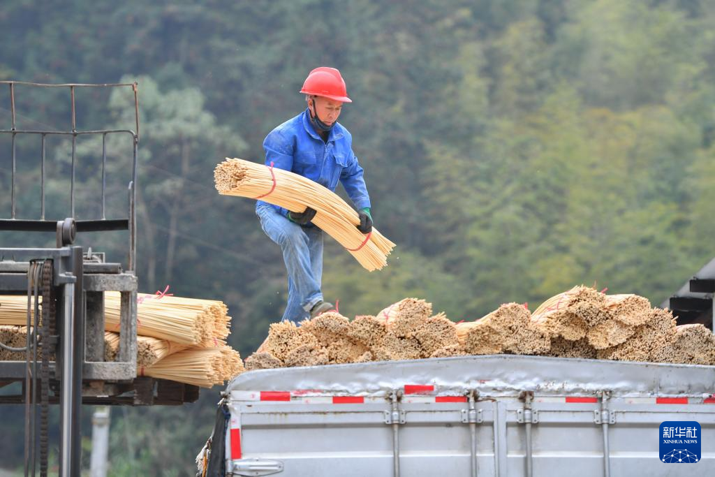 12月10日,村民在湖南省郴州市桂东县清泉镇桥头乡侠头村一家楠竹初加工企业将楠竹半成品装车。新华社记者 陈泽国 摄pagebreak