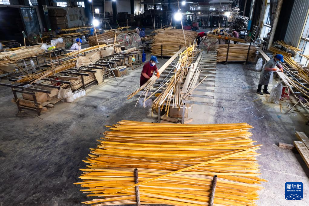 12月10日,在永州市双牌竹木产业科技园,湖南省有竹科技有限公司工人在加工竹条(无人机照片)。新华社记者 陈思汗 摄pagebreak