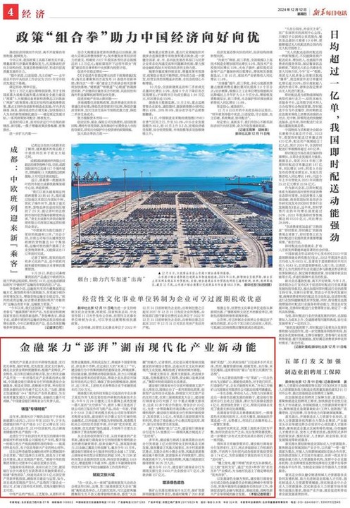 新华社北京12月12日电 12月12日,《新华每日电讯》发表题为《金融聚力“澎湃”湖南现代化产业新动能》的报道。