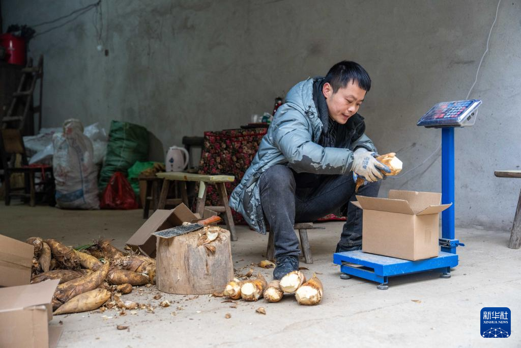 12月10日,在永州市双牌县何家洞镇,唐亚南在打包竹笋。新华社记者陈思汗 摄