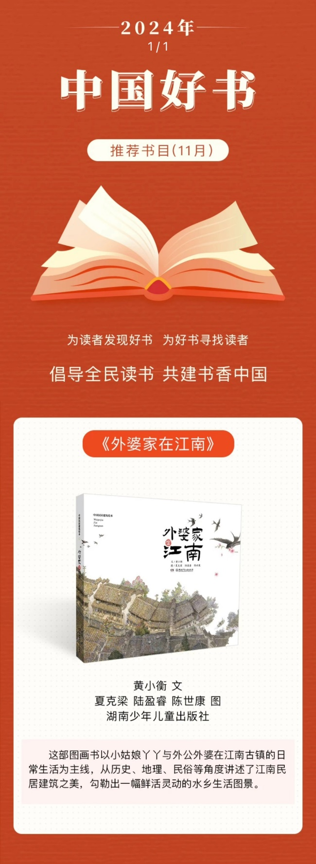 日前,在中宣部出版局指导下,经中国图书评论学会组织评选,2024年11月“中国好书”推荐书目发布。此次共15本图书入选推荐书目,湖南少年儿童社出版的《外婆家在江南》位列其中。