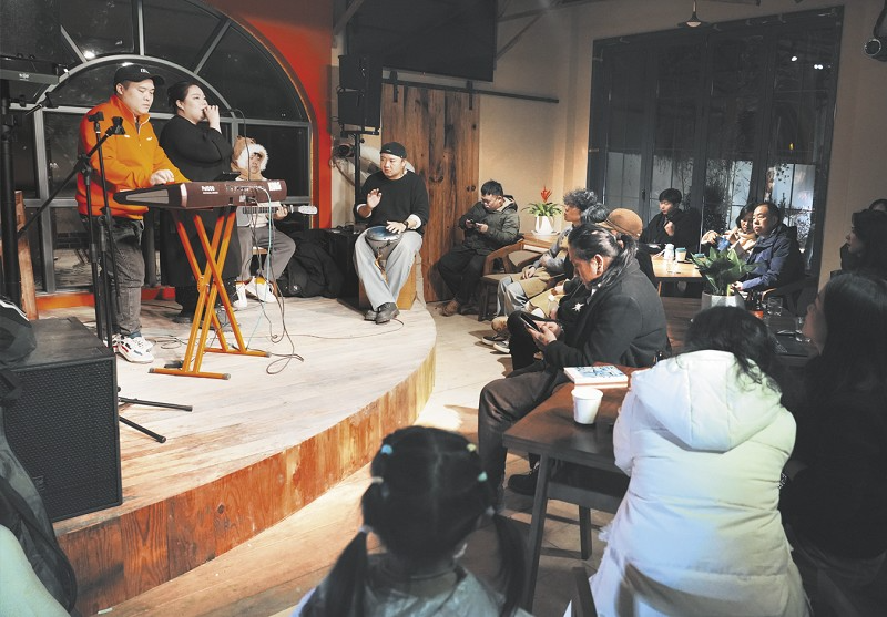 走进茶子花街,越过几家擂茶馆,你会发现一家可以看书的清吧——野渡文学清吧。一进店,一座圆形书墙映入眼帘,庭院里复古红墙搭配“上房揭瓦”的设计,令人眼前一亮。“在我们这里可以看书、喝酒、喝咖啡、听民谣……”主理人许非仙想为热爱生活的人打造一个休闲放空、充满文学气息的角落。“今天晚上,还会有本土乐队的表演。”许非仙笑着告诉记者,目前店里仅有少量的位置可供预订。