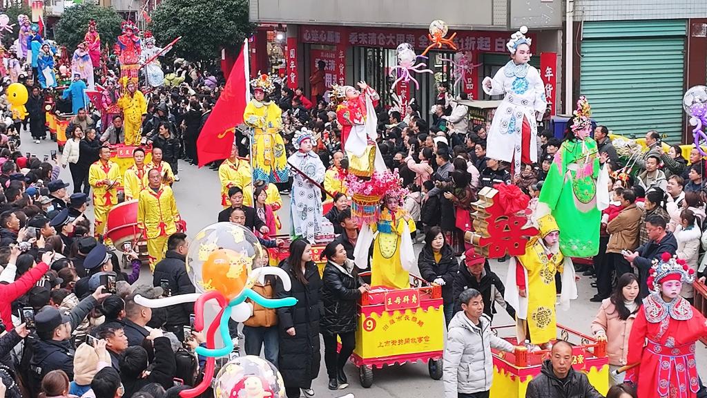 正月十四,湖南省汨罗市长乐镇狭长的街道上人潮涌动。“咚咚锵”的锣鼓声响起,在街道中央行进的小戏台上,穿着戏服的演员们根据故事情节摆出各种造型。这便是当地特色的元宵节民俗活动“长乐抬阁故事会”。