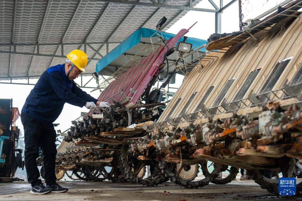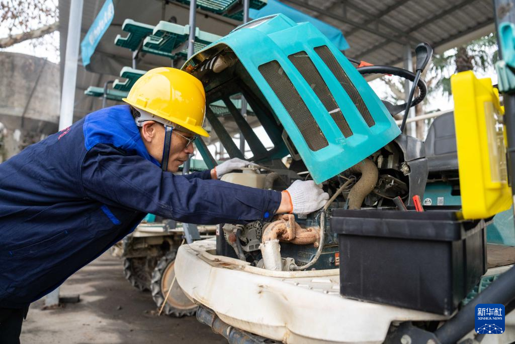 2月21日,在长沙市望城区桥驿镇一家农机专业合作社,农机技术人员在检修插秧机。新华社记者 陈思汗 摄pagebreak
