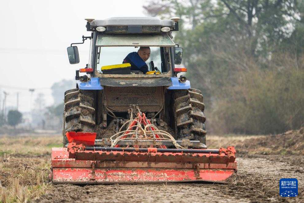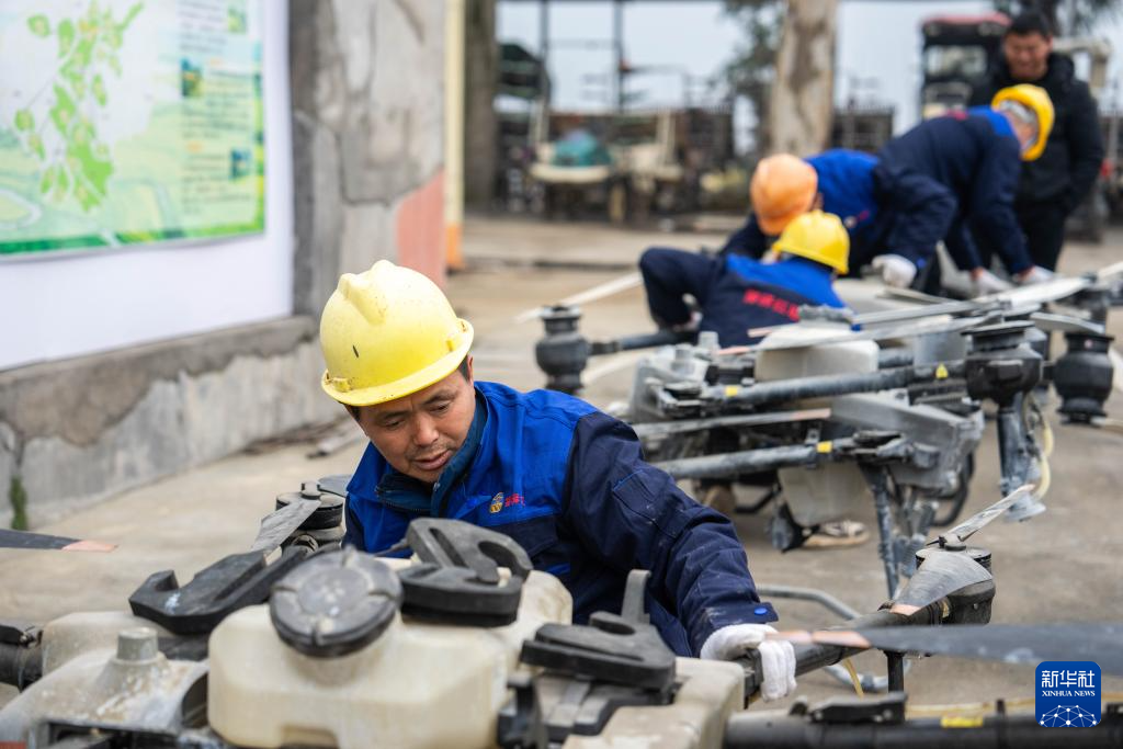 2月21日,在长沙市望城区桥驿镇群力村,农机技术人员在检测调试旋耕设备。新华社记者 陈思汗 摄