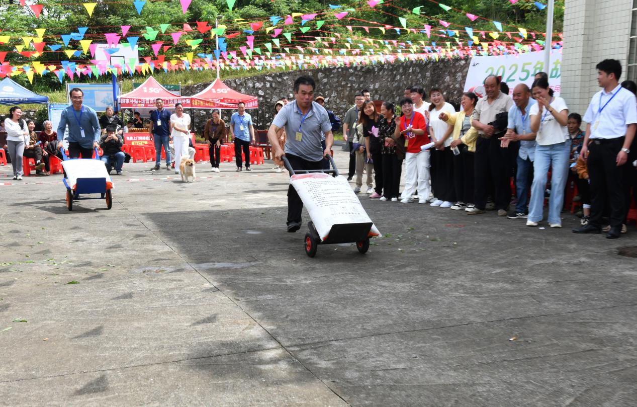 5月1日,常宁市板桥镇先峰村“趣闹春耕”农民趣味运动会上,参赛群众在进行“轮车运肥接力”比赛。