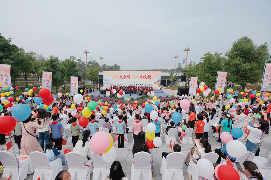 10月1日,长沙市望城区大泽湖近自然湿地公园内一片欢腾,《红旗颂》歌声嘹亮、日景烟花绚烂绽放、彩色气球迎风飞扬,“Ai在大泽湖 家国共欢腾”系列活动拉开帷幕。