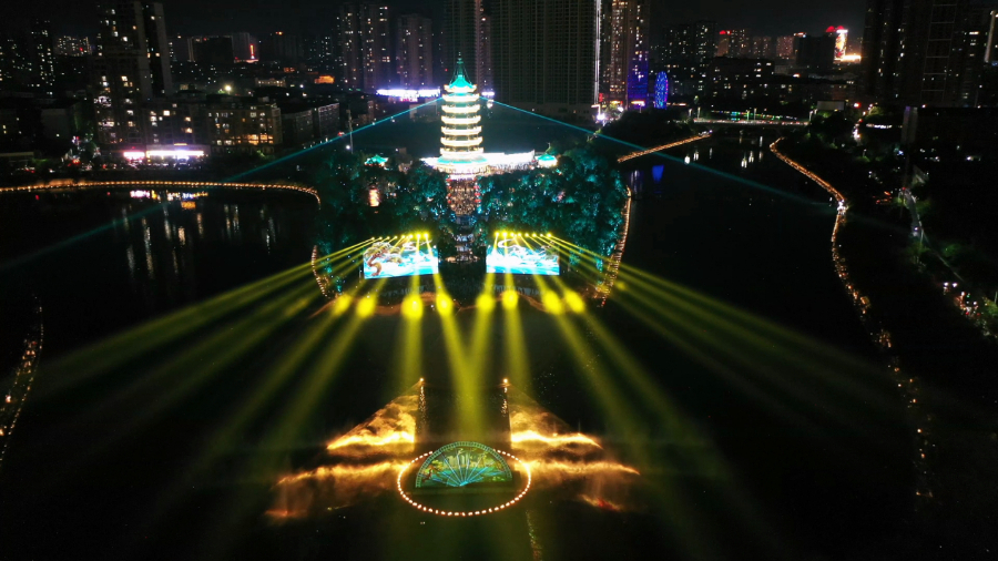 晚上7时30分,景区灯火次第点亮,28米高的观鹤楼的飞檐斗拱在灯光映照下熠熠生辉;《鹤鸣福地》响起,中心喷泉随音乐节奏腾跃舒展,多彩水柱在灯光中幻化出丹顶鹤展翅等造型;一旁的升降LED屏缓缓升起,滚动播放着怀化古城变迁、民俗风情等画面,与太平溪两岸的建筑灯光交相辉映,构成“一河两岸”的灵动夜景。