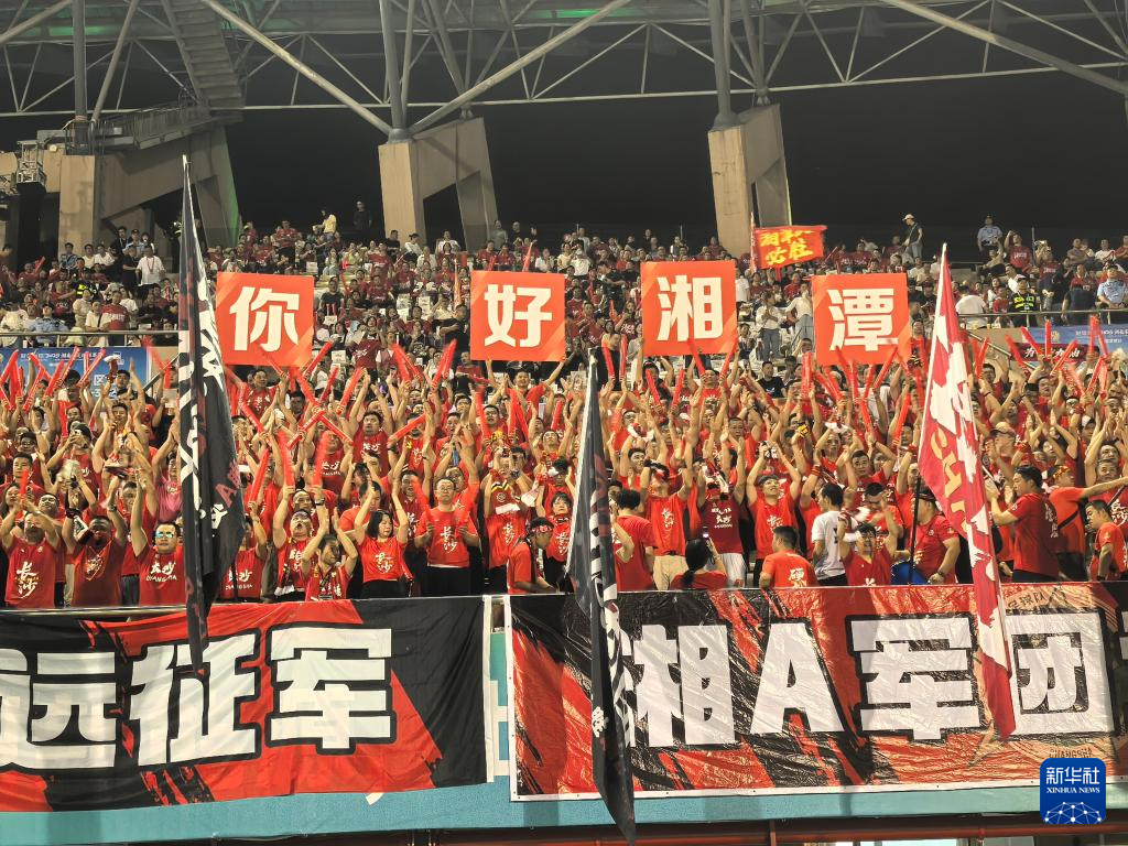 9月28日,长沙球迷在看台上举起“你好湘潭”标语。新华社记者 谭畅 摄