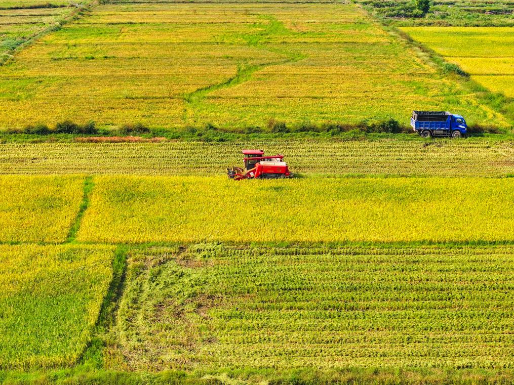 10月11日,湖南省衡阳市衡山县白果镇村民驾驶农机收割稻谷(无人机照片)。新华社发(曹正平摄)pagebreak