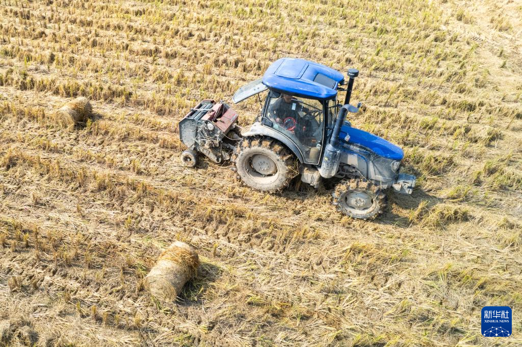11月5日,在长沙县开慧镇开慧村,村民操作牵引式秸秆打捆机回收水稻秸秆(无人机照片)。新华社记者 陈思汗 摄pagebreak