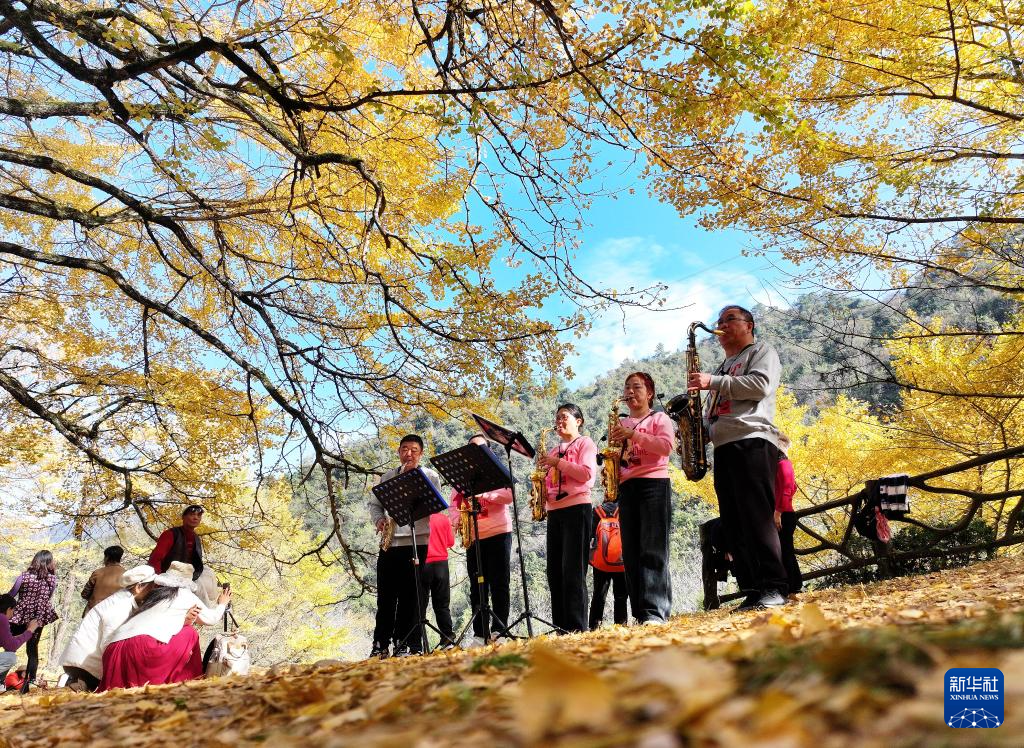 11月23日,萨克斯爱好者在桐子坳村银杏树下为游客表演。新华社记者 赵众志 摄pagebreak