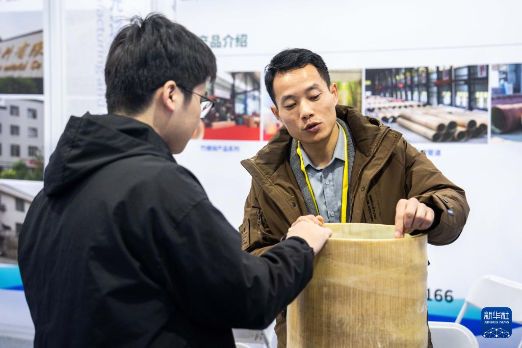 11月27日,在娄底经开区电力科技谷,参展商(右)在介绍竹缠绕复合材料。新华社记者 陈思汗 摄pagebreak