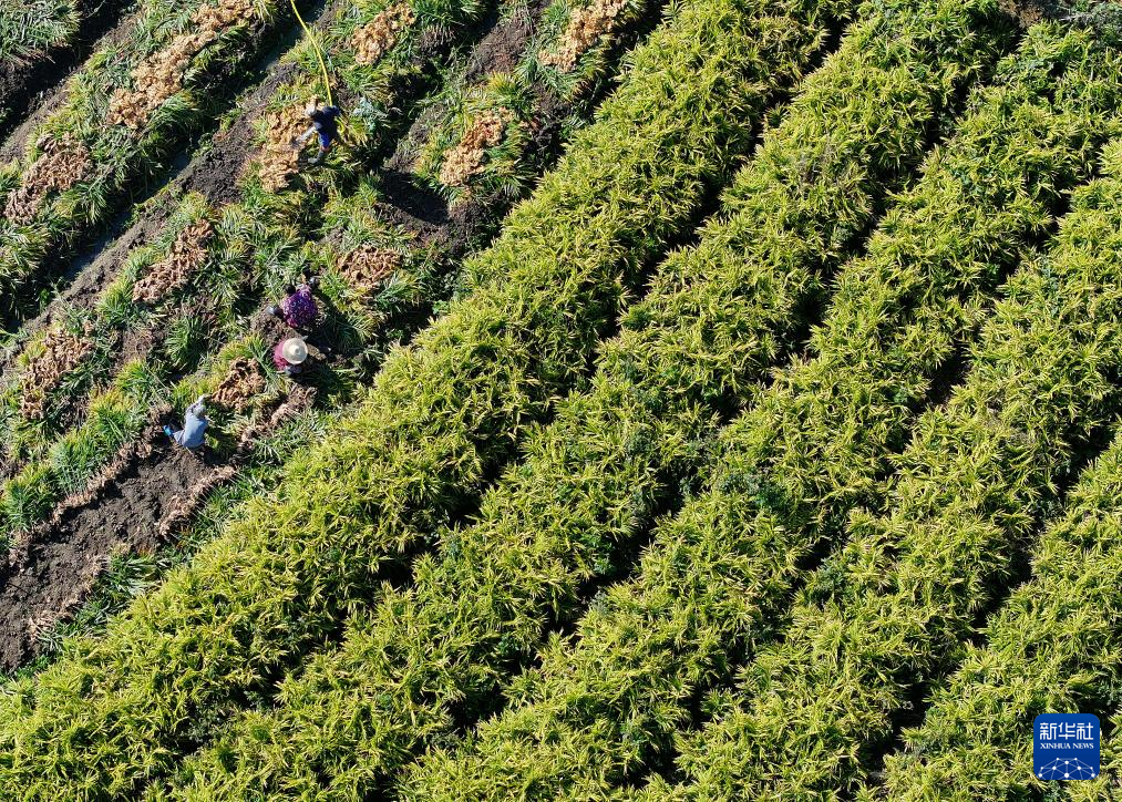 11月24日,郴州汝城县金山村村民在田里收获小黄姜(无人机照片)。新华社记者 赵仲志 摄pagebreak