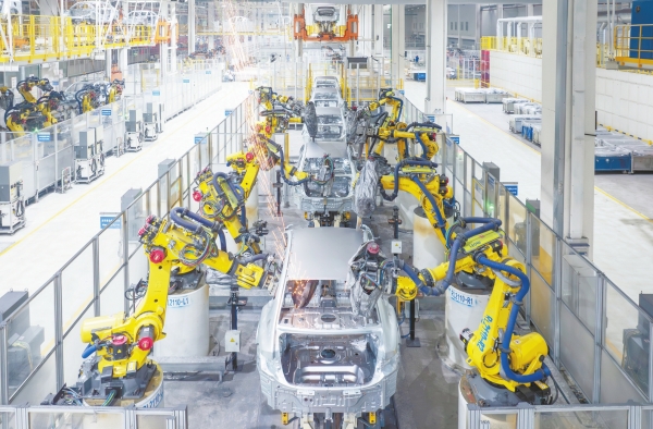 3月13日,长沙比亚迪雨花基地焊装工厂,智能化生产线上的机械臂伸缩旋转,有条不紊地完成焊接工作。湖南日报全媒体记者 辜鹏博 摄