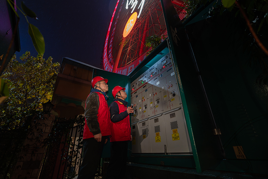 2025年12月31日晚11:40,国网长沙供电公司(电雷锋)东方红共产党员服务队员在世界之窗跨年活动现场检查商户用电安全。新华网发 石磊摄