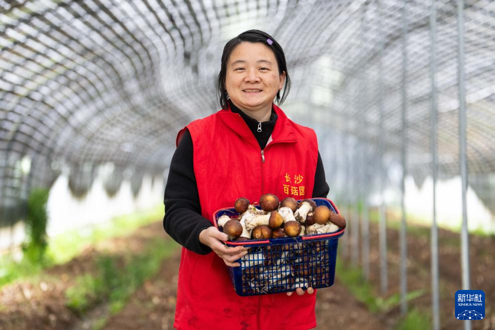 3月17日,在湖南省长沙市望城区靖港镇采丰蘑菇种植园,村民在展示刚采摘的姬松茸。新华社记者 陈思汗 摄