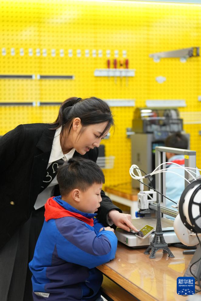 3月17日,老师在湖南湘江新区雷锋小学的3D打印课上辅导学生完成作业。新华社记者 薛宇舸 摄pagebreak