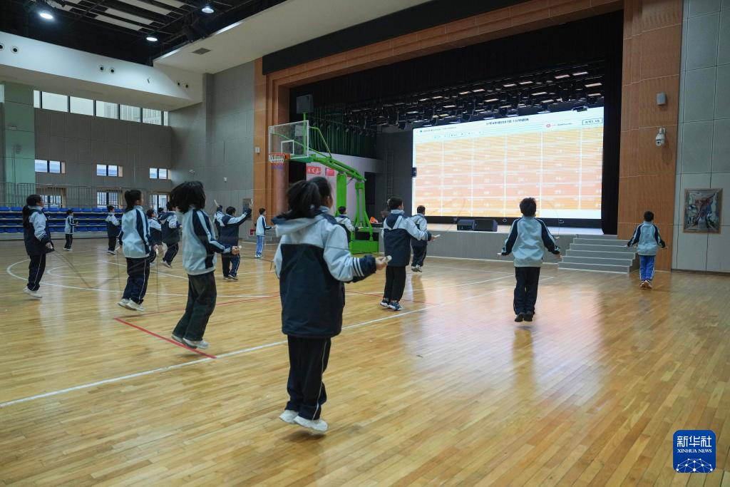 3月17日,学生在湖南湘江新区雷锋小学体育课上练习跳绳,他们的跳绳次数会实时投放到大屏幕上,帮助老师掌握每个学生的运动情况。新华社记者 薛宇舸 摄pagebreak