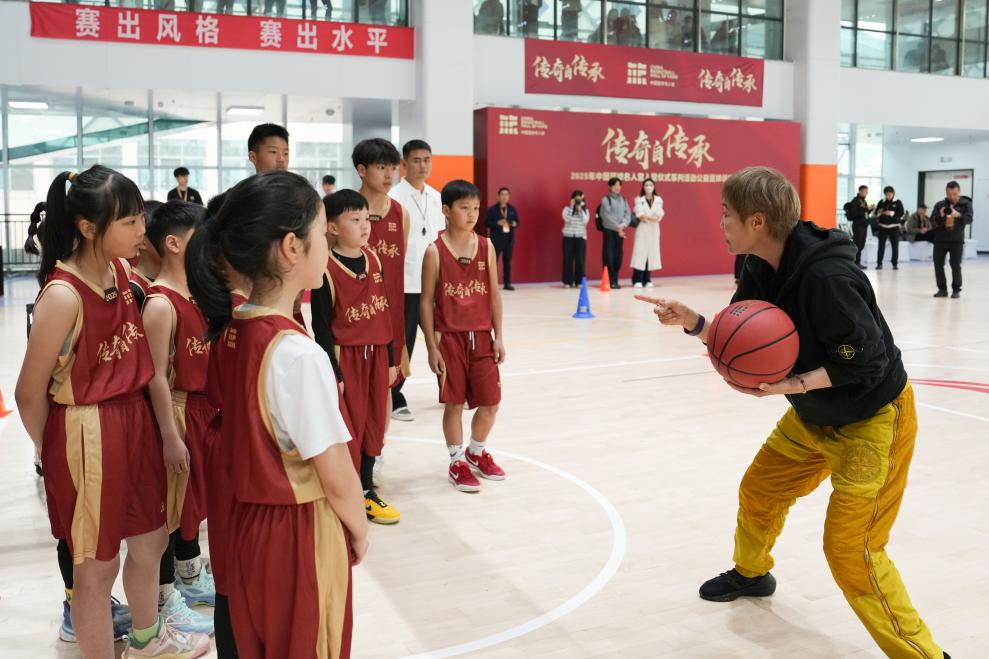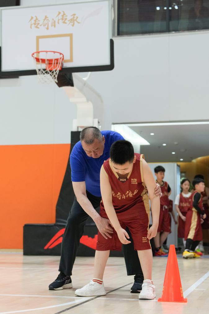 2026年4月11日,在2025年中国篮球名人堂入堂仪式系列活动公益篮球训练课中,中国篮球名人堂“优秀集体”成员吴庆龙(前)指导小球员技术动作。