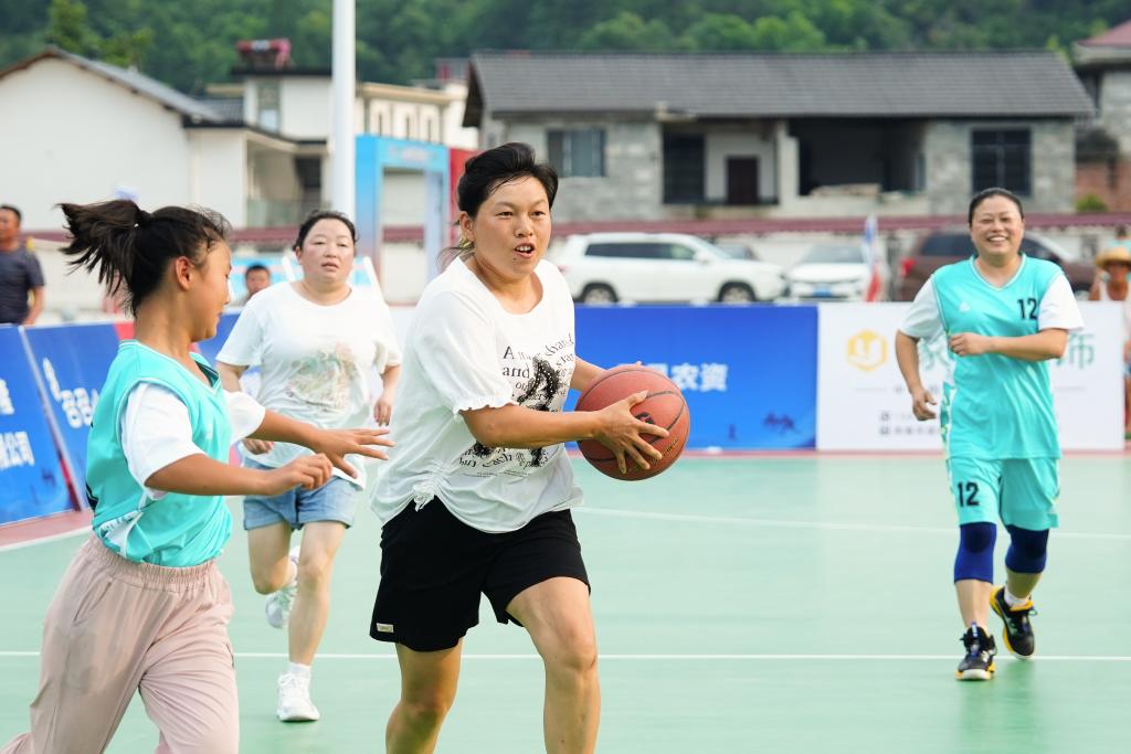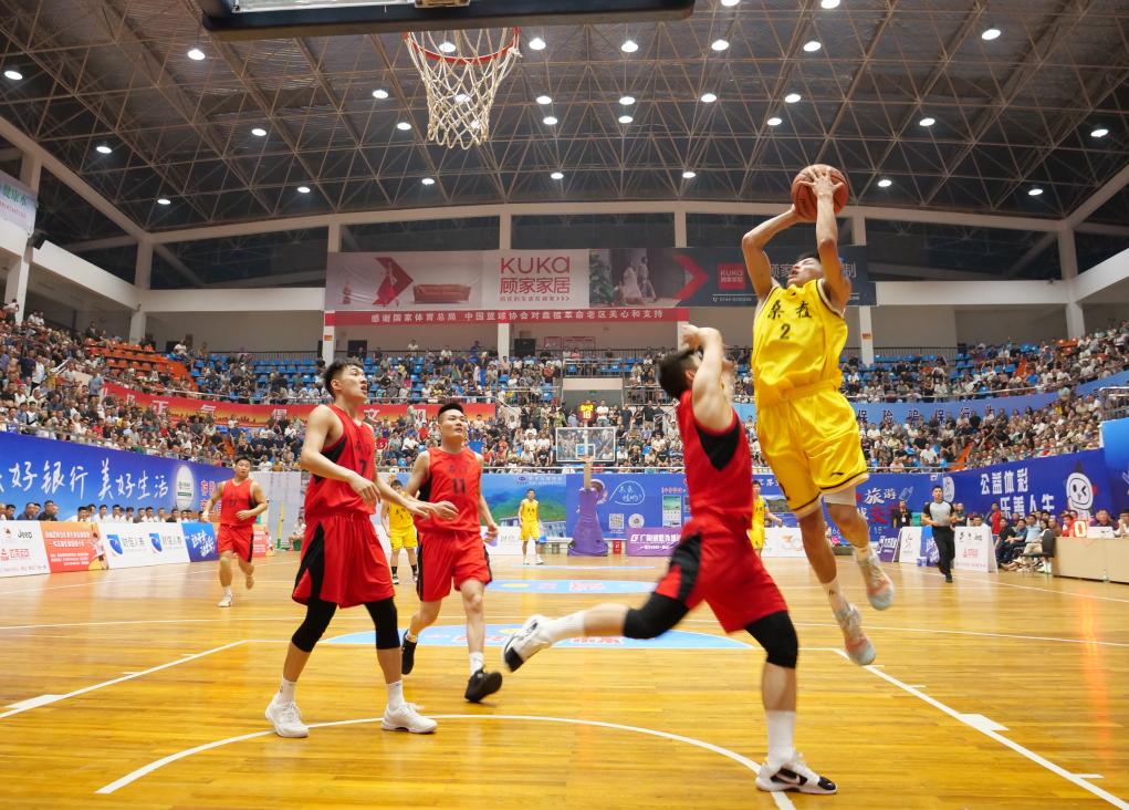 2024年8月24日,在湘鄂边老苏区第二十五届“贺龙杯”篮球友谊赛中,张家界桑植队(黄)对阵常德石门队。
