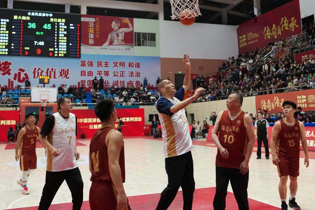 2026年4月11日,在2026年中国篮球名人堂入堂仪式系列活动“公益民星嘉年华”中,中国篮球名人堂成员孙军(左二)、中国篮球名人堂“优秀集体”成员巴特尔(右三)、吴庆龙(右二)和桑植篮球爱好者同场竞技。