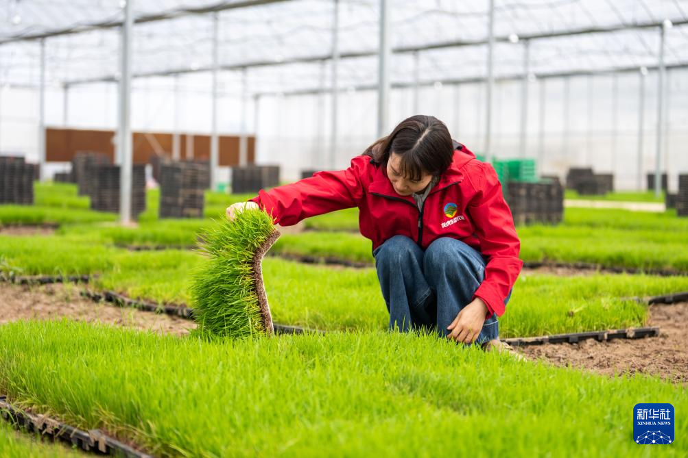 4月17日,在高塘岭街道湘江村智慧农场育秧大棚,工作人员在观察秧苗长势。新华社记者 陈思汗 摄