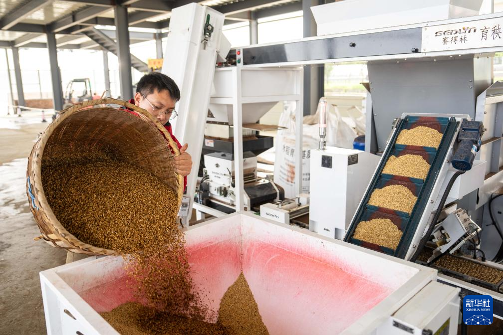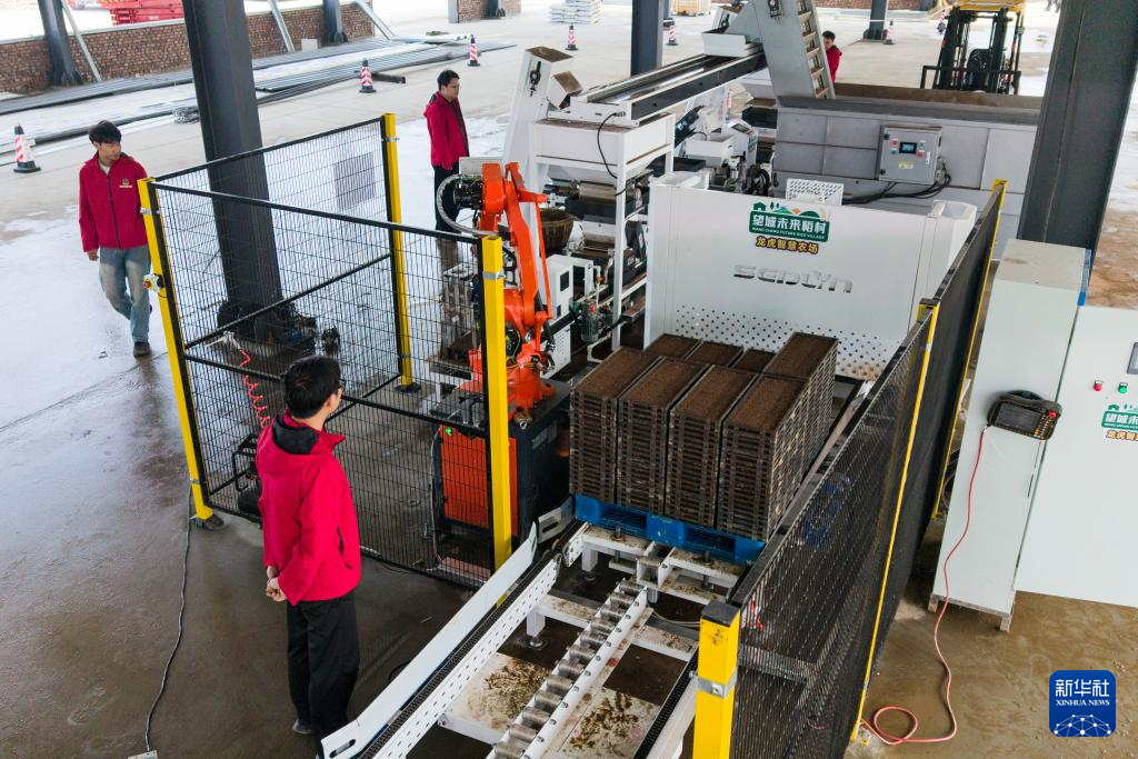 4月17日,在高塘岭街道湘江村智慧农场,工作人员在水稻育秧流水线进行稻种上料作业。新华社记者 陈思汗 摄